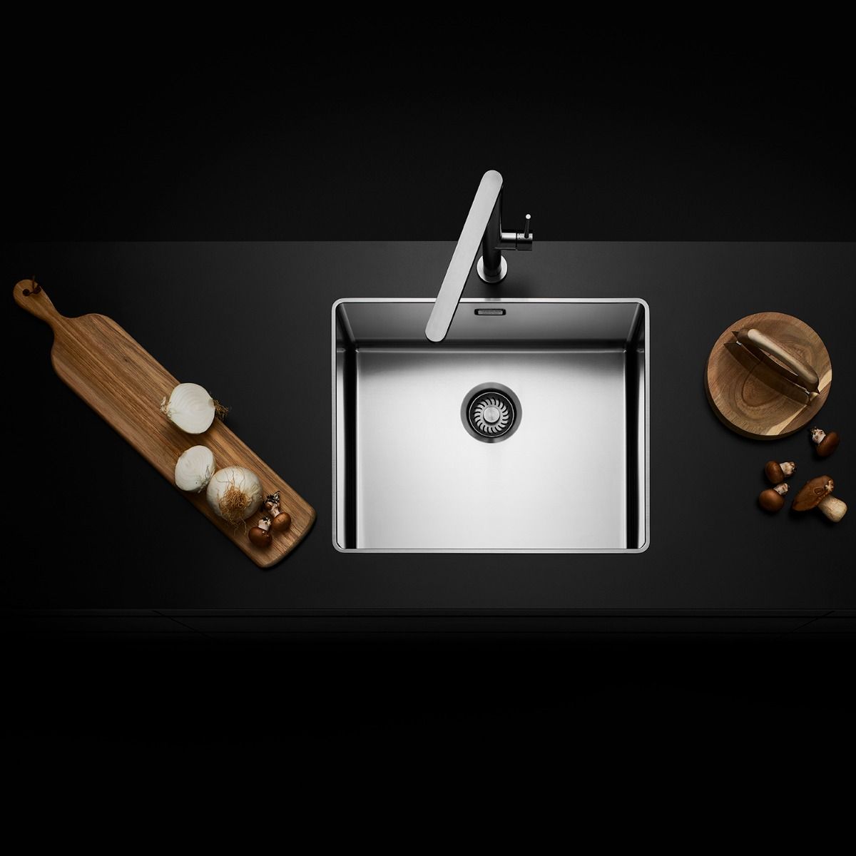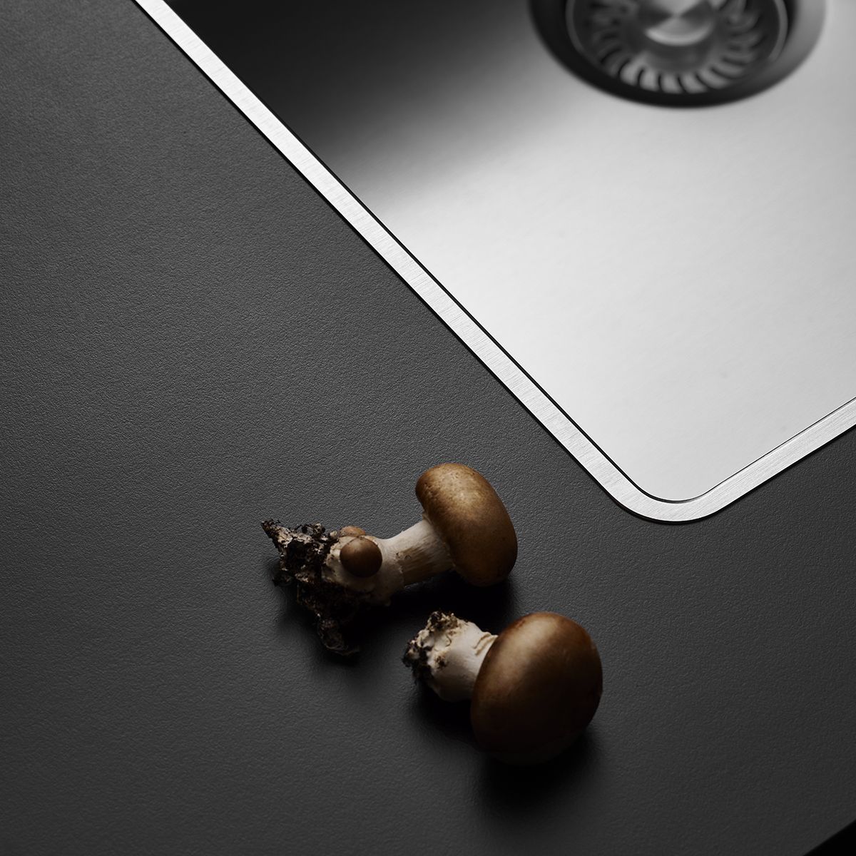 Integriran odtok je oblikovan tako, da se estetsko poveže z geometrijo posode. V praksi to pomeni, da korito deluje bolj urejeno, obenem pa zasnova posode podpira naravno uporabo v kuhinji – od priprave hrane do čiščenja. To je tipično za premium razred: funkcionalne rešitve so prisotne, a ne agresivne.