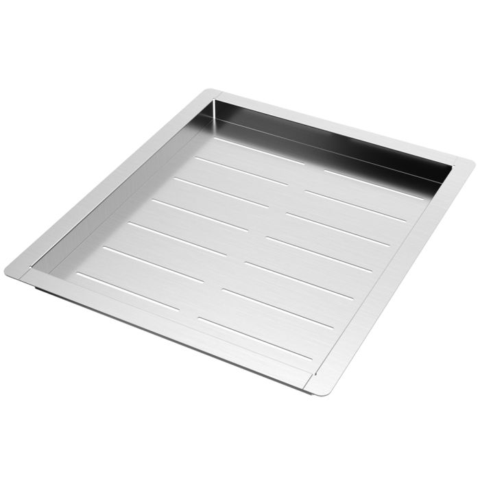 TASCA 280.AD drsni pladenj večjih dimenzij za odcejanje, s perforiranim dnom, izdelan iz nerjavečega jekla vam omogoča enostavno čiščenje in odcejanje zelenjave ter ostalih živil. Pladenj je kompatibilna z vsemi TASCA koriti globine 400 mm